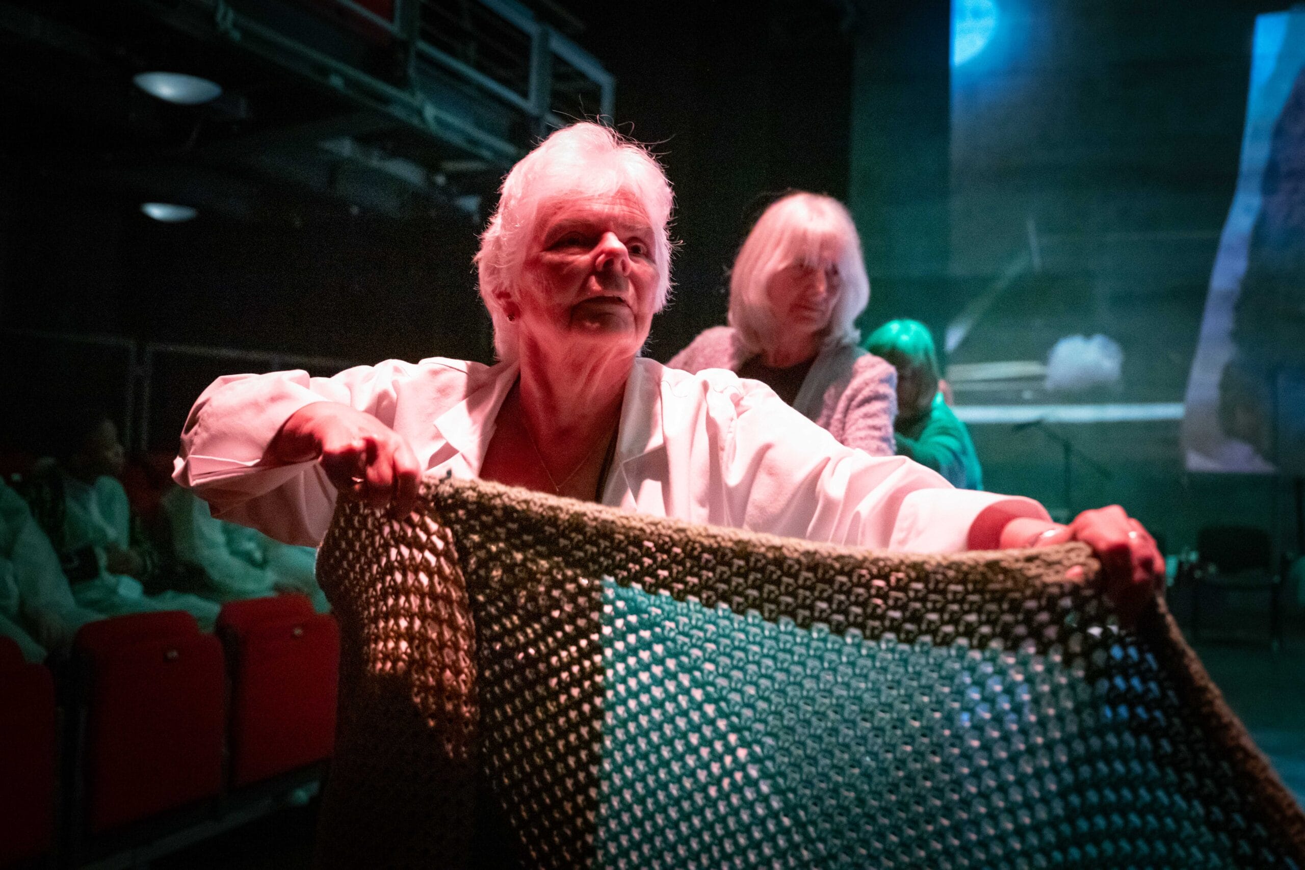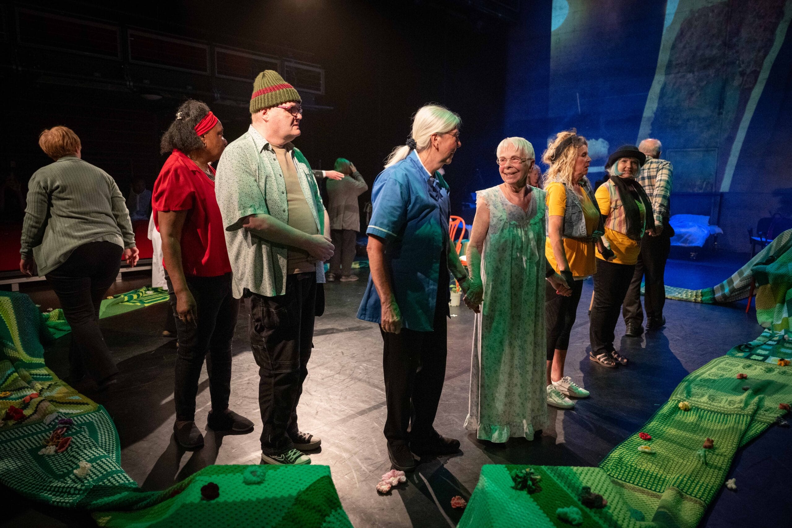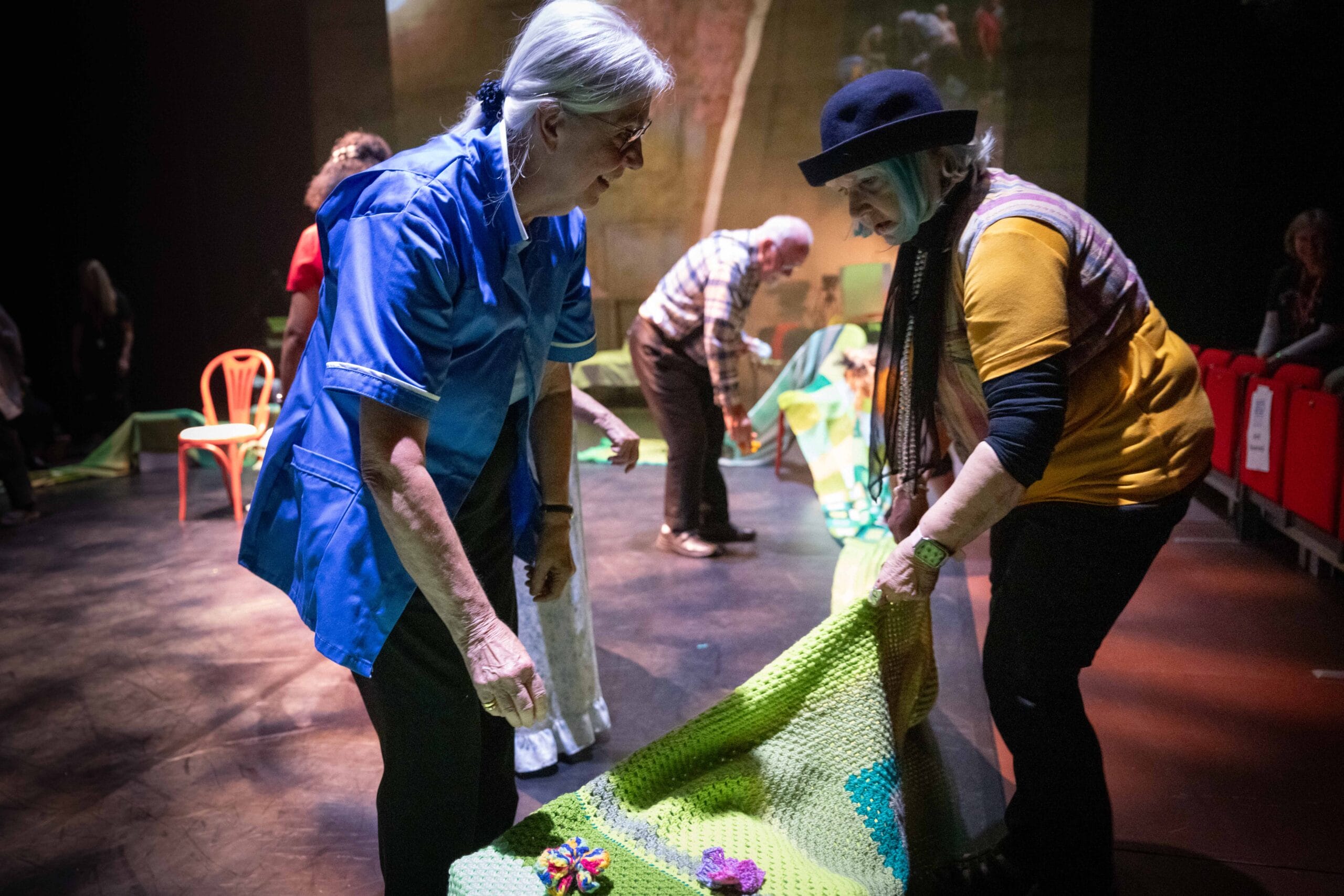 As part of the Over 50s Hub’s piece, the participants asked The Belgrade Crafternooners who are a craft group that meet weekly at the theatre to crochet and knit a giant ‘Spring Blanket’ for use in their performance. The group were delighted to help out and got stuck in with the ambitious project.